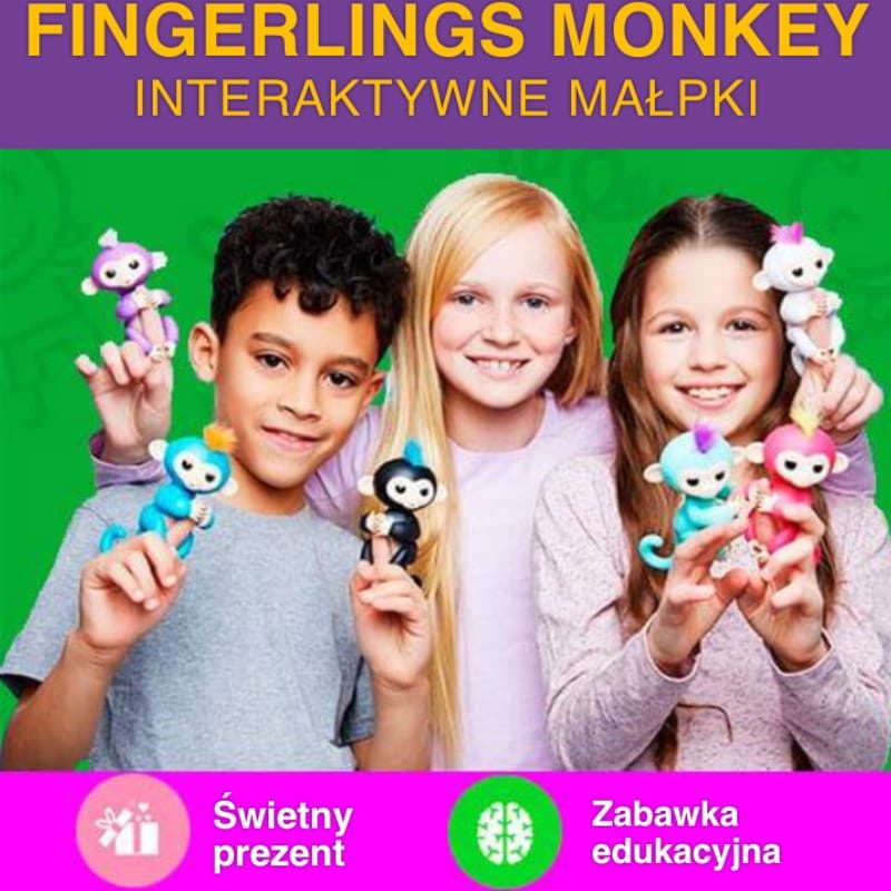 Interaktywna zabawka Fingerlings Monkey to ręczna elektroniczna, bardzo zabawna małpka, która uwielbia chwytać się mocno swoimi rączkami i nogami za palec, a także zwisać do góry nogami, łapiąc się ogonem za różne przedmioty. Interaktywne małpki Fingerlings Monkey zostały zaprojektowane i wyprodukowane przez WowWee, specjalizującą się w produkcji zaawansowanych robotycznych inteligentnych zabawek